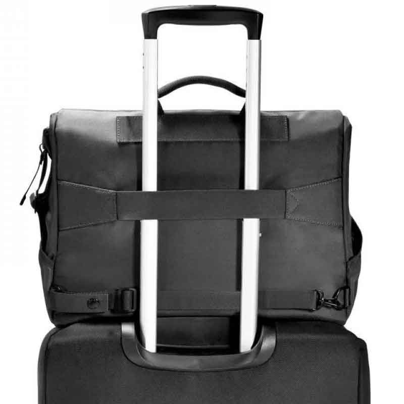 Сумка легко крепится к ручке чемодана для удобного перемещения по аэропорту.