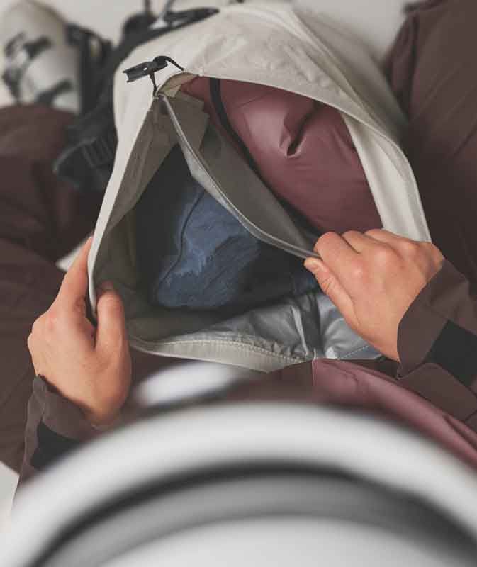 Компактный фрирайд рюкзак также имеет достаточно места для альпинистских лыж и кошек, что обеспечивает большую многофункциональность на горах. Аварийное оборудование можно аккуратно и удобно хранить в отдельном защищенном отделении, в то время как ко всем остальным вещам в основном отделении можно получить доступ через передний или задний доступ.