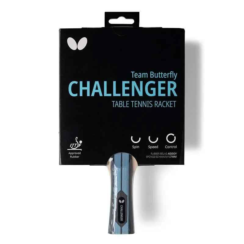 Butterfly Challenger FL - ракетка для настільного тенісу, характеризується контрольованим характером, але водночас дозволяє виконувати швидкі удари з насиченим обертанням. Вона оснащена гумовими накладками Addoy і товщиною губки 1,7 мм які схвалені ITTF для змагань. Team Butterfly Challenger – ідеальний вибір для початківців та гравців які володіють базовими та основними навичками. Вся серія створена для універсальної гри, оскільки вона дуже поблажлива та має хороший контроль, але між кожною моделлю є невелика різниця щодо швидкості та обертання.